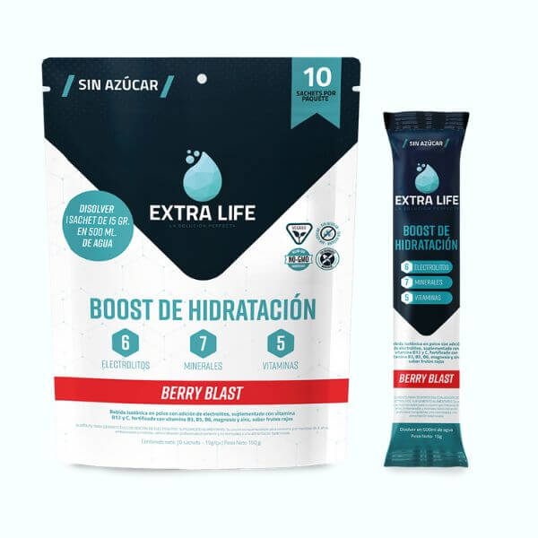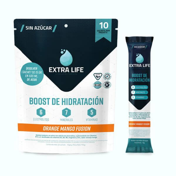 Extra Life es una bebida isotónica en polvo en formato sachet, con más de 1393 mg de electrolitos, vitaminas y minerales creada para combatir los efectos de la deshidratación y ayudarte con tu recuperación.